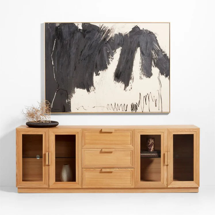Reveling in the sheer power of paint, Mary Elizabeth Peterson wields black pigment, swishing, slashing, and incising to create this expressive work. Our giclee print on the original canvas perfectly captures the painting's graphic tension and striking contrasts. To enhance its gallery presence, it's framed in a slim wooden frame. This versatile abstract painting can be hung vertically or horizontally, depending on your space. "Overarching" by Mary Elizabeth Peterson, white canvas, 65" x 47", framed wall art, 65" wide x 2.25" deep x 47" high